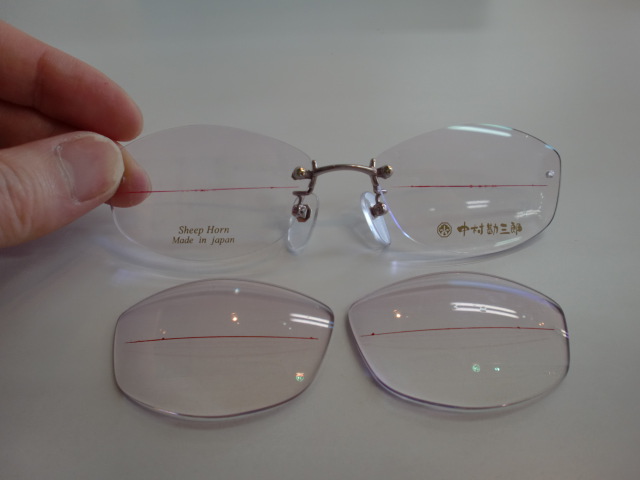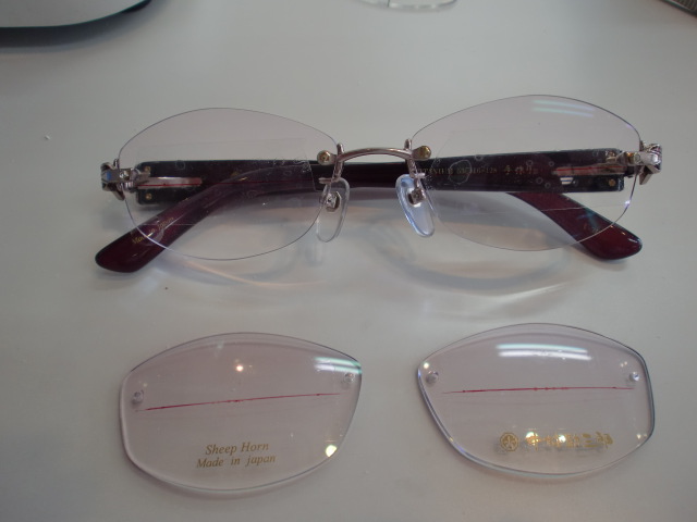 「こんな形に出来ないか」「この形をこっちのメガネに」など、お客様のご希望に沿って製作が可能です。また、持込フレームも受けていますので、家に眠っている縁無しフレームがあれば、一度使えるかどうかのご相談にご持参下さい。